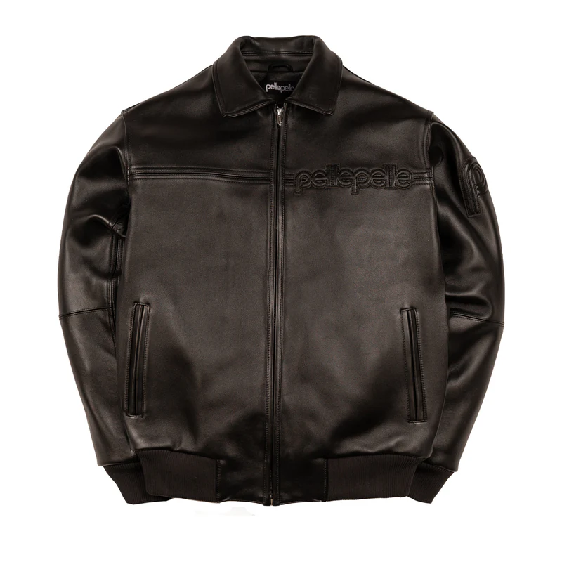 This jacket features classic Pelle Pelle elements, including rib-knit cuffs and hem, custom-branded zipper pulls, and embossed leather accents. The corded design enhances the jacket’s visual appeal while reflecting the brand’s attention to detail and dedication to urban fashion excellence.