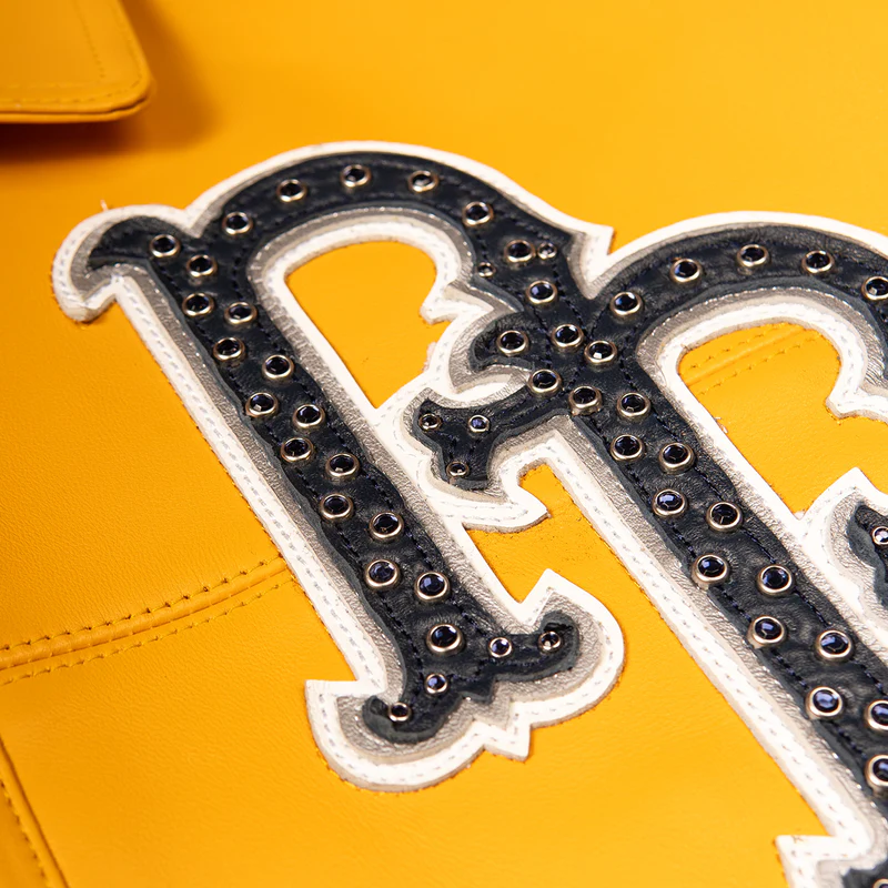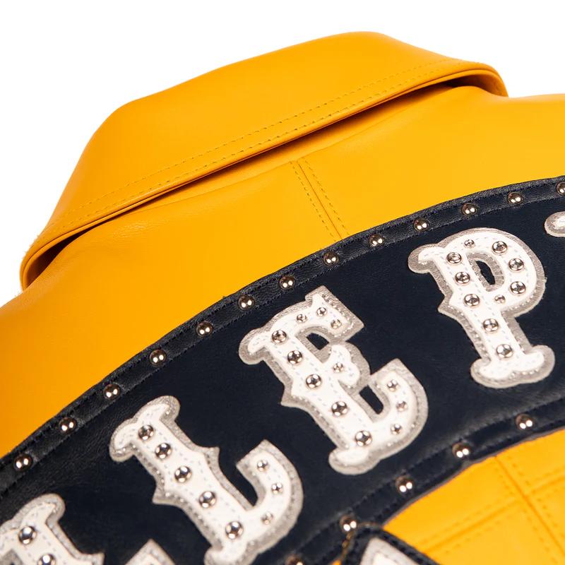 What makes this jacket truly special are its iconic Pelle Pelle details. The front showcases the famous double “P” leather patch, beautifully finished with rhinestones for a touch of shine. The eagle emblem and custom shield artwork represent strength, creativity, and the fearless legacy of the Pelle Pelle brand.