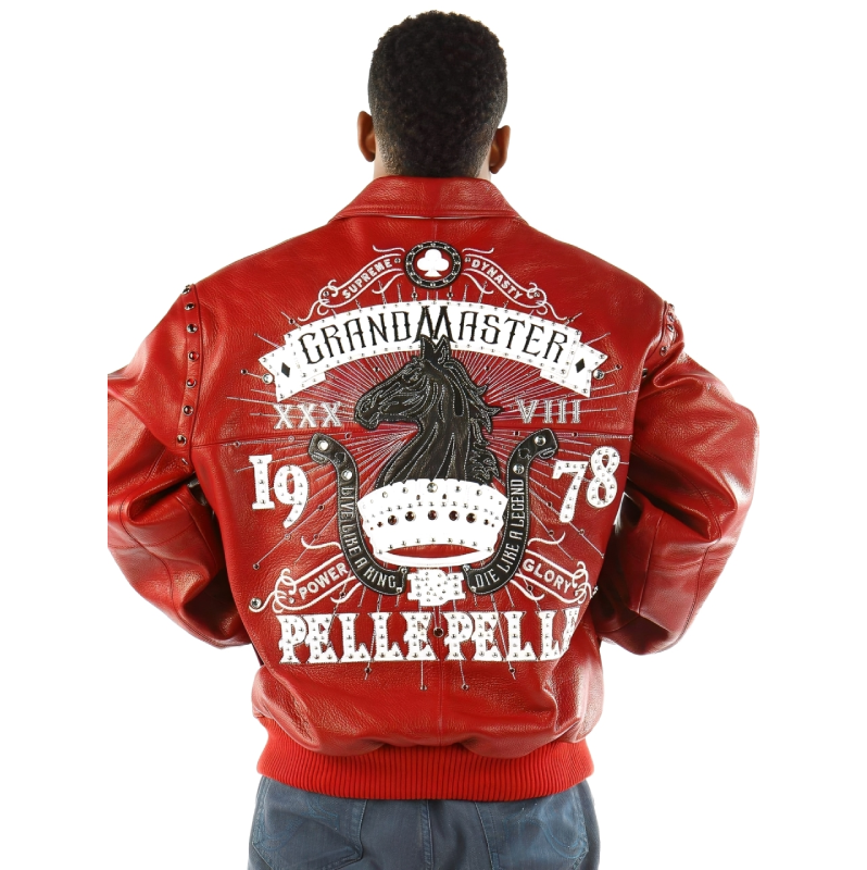 The style of this grandmaster red leather jacket is kinda like a blast from the past, from the 90s hip-hop and street scene. It features a huge Pelle Pelle and Grandmaster logos, as well as crazy stitched patches and shiny embellishments like rhinestones and studs, making it a feast for the eyes. With a bomber jacket silhouette, this men’s red leather jacket features a full zipper and thick, ribbed edges on the hemline, giving it a look that’s both tough and classy.
